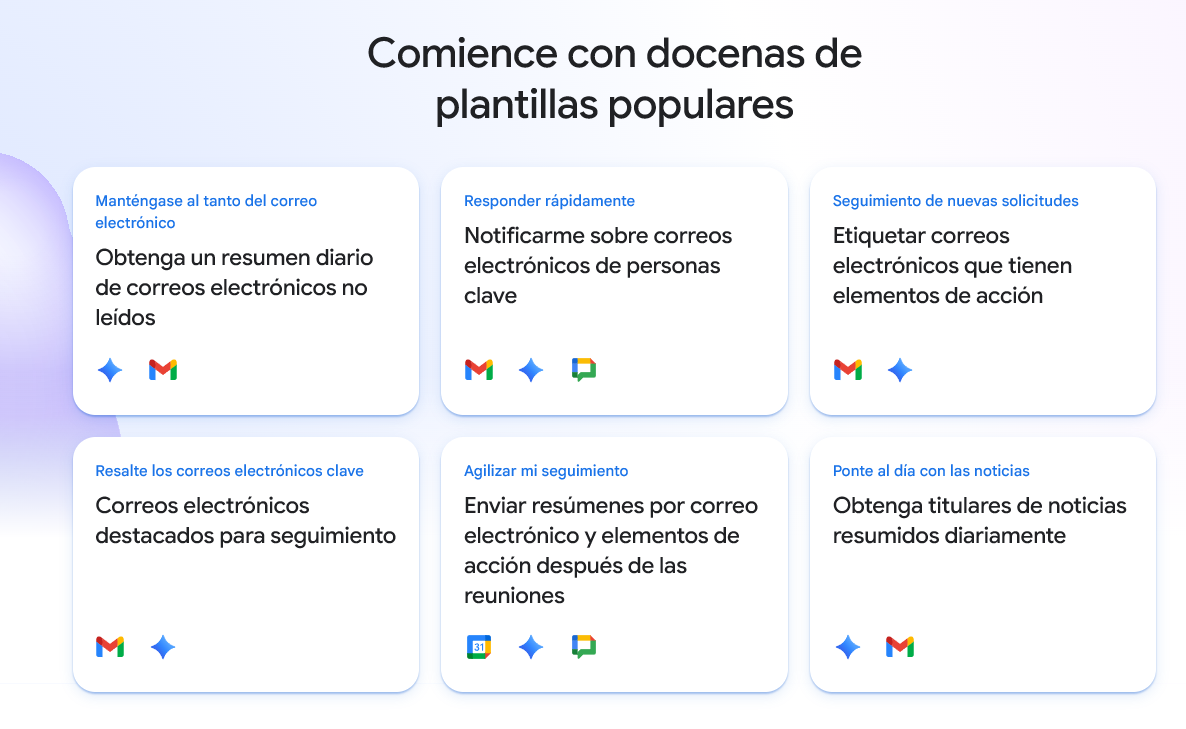Solo describes lo que necesitas automatizar y Gemini genera el agente. Esto reduce el tiempo de configuración para equipos sin perfiles técnicos.